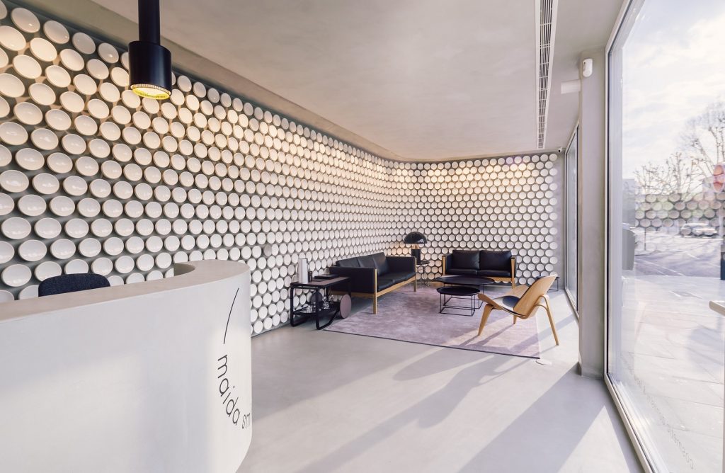 Desde logo, o espaço da clínica diferencia-se pelo design. A inspiração geral baseia-se no tema dos implantes dentários em cerâmica, sendo que a ideia é representar cada paciente na sua individualidade. Mais de 1600 discos de cerâmica artesanal cobrem as paredes da clínica, num aglomerado ao estilo de favo de mel, proporcionando um bordo moderno e limpo: “esforçámo-nos por criar uma marca que fosse moderna, simples, sofisticada e intemporal – para espelhar os sorrisos que criamos no local todos os dias. O resultado final é uma experiência dentária única e memorável”. O design delicado e personalizado da clínica fornece uma indicação da atenção aos detalhes e foco pessoal dada a cada um dos pacientes, “destacando, por sua vez, a busca de precisão e excelência clínica por parte da Maida Smiles”. O design minimalista e de fluxo livre maximiza ainda mais o espaço, com a parede de cerâmica feita à medida e o mobiliário icónico a trabalhar em conjunto para criar uma dinâmica calmante.