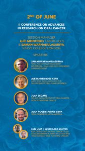 Dos vários palestrantes destacam-se Fernando Exposto (Universidade de Aarhus, Dinamarca), Júlio Fonseca (Universidade de Coimbra), Victor lloro (Spain), Ana Lúcio Messias (Universidade de Coimbra), Saman Warnakulasuriya (King´s College London and WHO), Alexander Ross Kerr (NY University, USA), Juan Seoane (Universidade de Santiago de Compostela), Alan Roger Silva (University of Campinas – UNICAMP), Luis Lima e Lúcio Lara Santos (IPO – Porto) e James Heyding (USA).