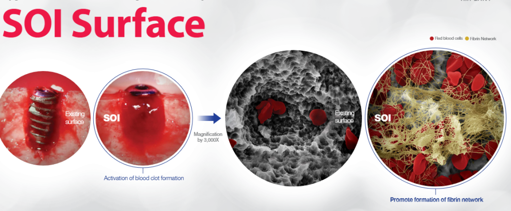 Há quase uma década, os investigadores da Osstem desenvolveram a tecnologia pioneira SOI, um tratamento de superfície que melhora substancialmente a osteointegração. Este tratamento SOI impede a formação de biofilme e forma rapidamente coágulos sanguíneos na superfície do implante, ativando uma rede de fibrina, resultando numa maior fixação óssea em comparação com outros tratamentos de superfície de implantes.
